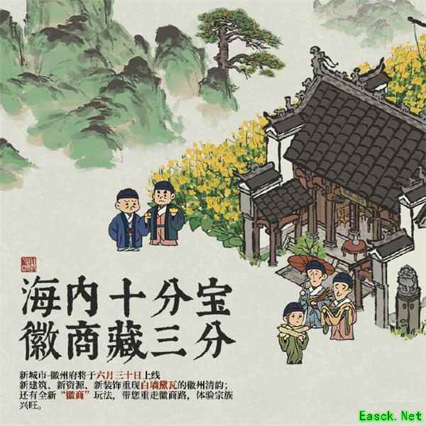 《江南百景图》徽州府介绍6月30日,出发下一站新城——徽州府! 新建筑、新资源、新装饰重现白墙黛瓦的徽州清韵。 更有全新徽商玩法,重走徽商路,体验宗族兴旺。