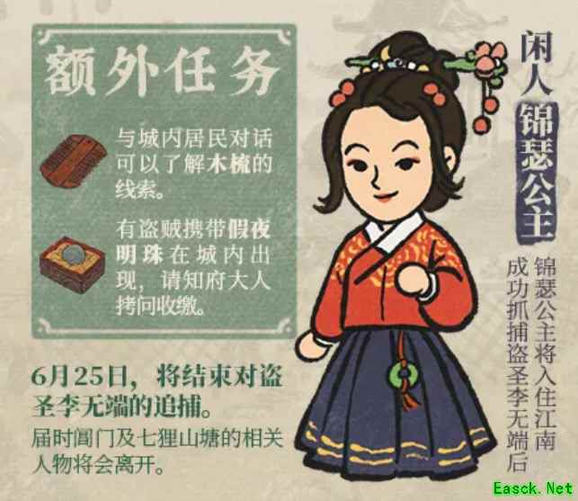 锦瑟公主获取攻略【获取攻略】 ▶6月19日起,城中将出现携带手帕碎片的盗贼; ▶ 6月20日起,城中将出现携带盗圣线索的盗贼。 收集齐所有回忆之物即可将盗圣捉拿归案! 案情破解之后,将会获得全新闲人【锦瑟公主】。