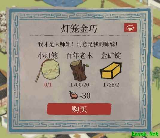阊门杂货阿意店铺位置:七狸山塘 在探险活动中,玩家需要完成灯笼金巧的任务,其任务要求就是要玩家收集小灯笼、百年老木、金矿锭三个物品,其中百年老木、金矿锭都可以在地图中收集到,但是小灯笼是需要在阿意的杂货店铺进行购买的。 阿意的杂货铺就在七狸山塘的梅花林那里,玩家前往七狸山塘就可以看到一个店铺了,在左边的位置,阿意就在那里不停的招手,点击就可以进入它的杂货铺了。 想要购买小灯笼需要毛竹*6、原料纸*8、梅花*8,这些材料都可以在地图中进行收集,收集齐就可以进行购买了。