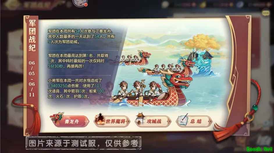 5、军团战纪 可以点击军团战纪页面右下角查看战纪按钮浏览上周军团活动总结。军团战纪共分为4个部分:赛龙舟、世界魔将、攻城战、总结。 在总结界面可以通过饼图直观的看到自己本周各军团活动的活跃情况。此外界面右侧将显示所属军团的基本信息以及玩家本周的活动积分和称号。