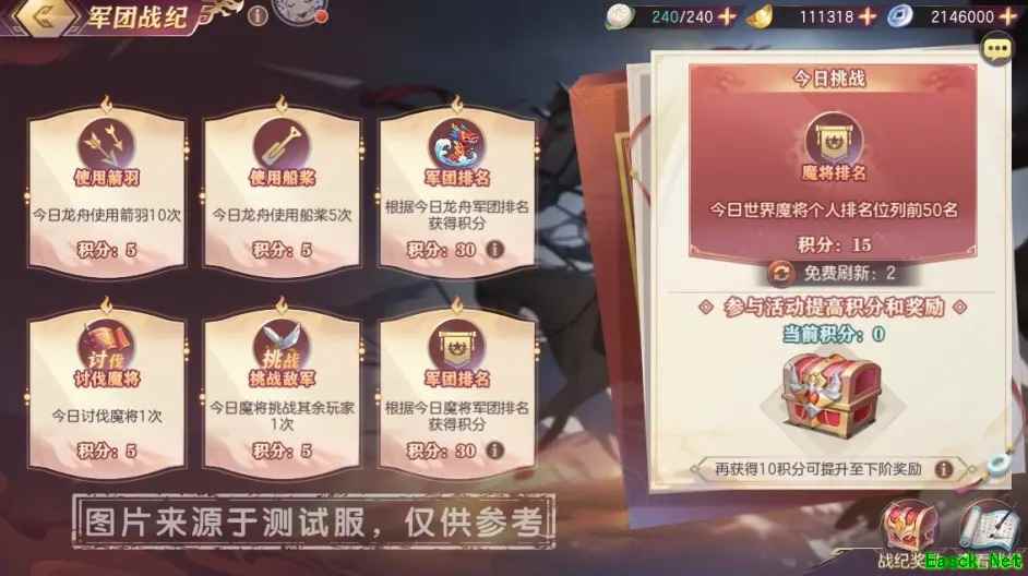 4、军团任务 每天5:00会重置并刷新出6个普通任务和1个挑战任务,普通任务固定不可刷新,挑战任务可以刷新并随机替换为其他任务。达成任务要求即可获取对应积分,提高积分以提升评级以及每日奖励。不同积分档位对应不同数量的元宝、军团每日补给包奖励。
