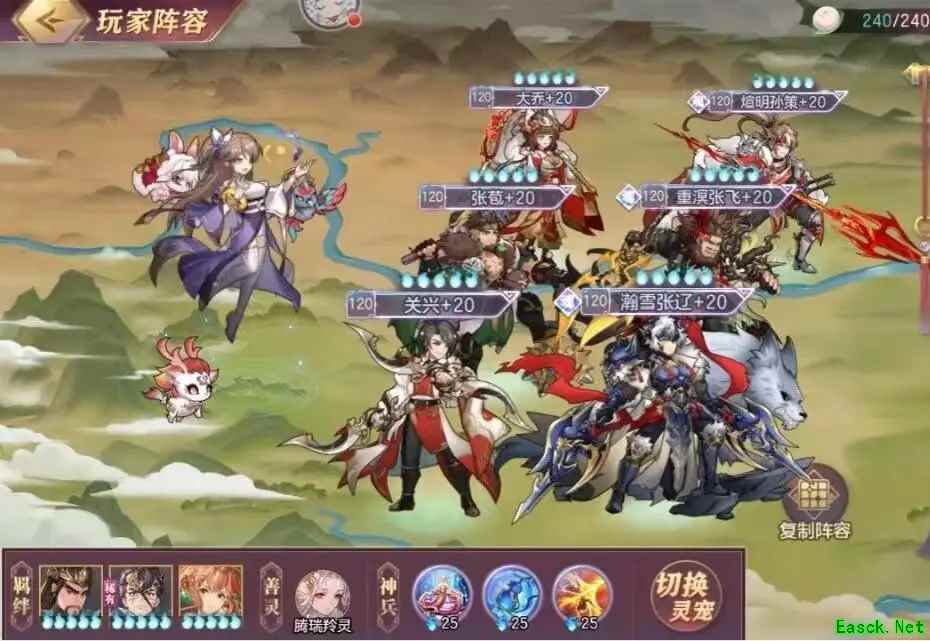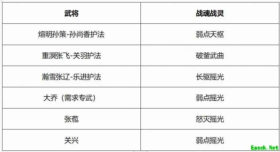 武将:煊明孙策-孙尚香护法、重溟张飞-关羽护法、瀚雪张辽-乐进护法、大乔(需求专武)、张苞、关兴 灵宠:主战卯兔、助战毕方、助战鹿蜀 神兵:和氏璧、葫芦、弓 善灵:羚灵/雀灵 风物志天赋:山河海阔、羽化登仙 战魂战灵: