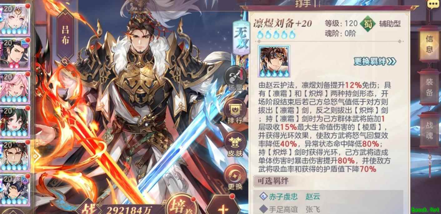 《三国志幻想大陆》凛煜刘备战斗实测:凛煜刘备总共有两个羁绊,分别是偏向输出的赵云,以及偏向于盾辅抗队的张飞。但是赵云的羁绊数值更高,也是大多数玩家会选择的玩法。效果是让我们的免伤提升百分之十二,并拥有凛霜、炽烨等两种不同的持剑状态。还有个类似于张辽的格挡效果,会为自己施加可吸收百分之十五最大生命值伤害的护盾。命中敌方武将时怒气恢复效率会降低百分之四十,异常状态的命中率会降低百分之八十。