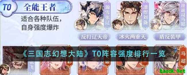 三国志幻想大陆T0阵容强度排行是什么?在游戏三国志幻想大陆中,拥有着众多的武将。但对于玩家来说资源却是有限的,那么如果我们想要把有限的资源发挥出最大的效益就需要选择强势的武将进行培养。那么今天我们就来介绍一下三国志幻想大陆T0级别的武将吧。