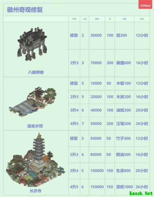 《江南百景图》徽州奇观修复攻略奇观修复 具体修复方法和数据看下图