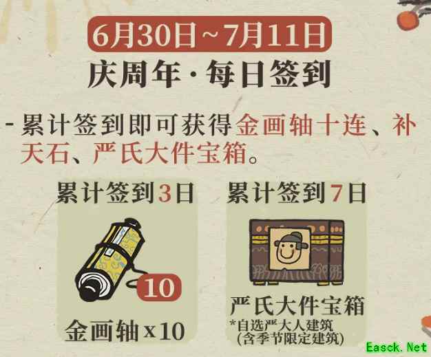 周年庆签到活动介绍活动时间: 6月30日~ 7月11日 活动内容: 累计签到即可获得金画轴十连、补天石、严氏大件宝箱。