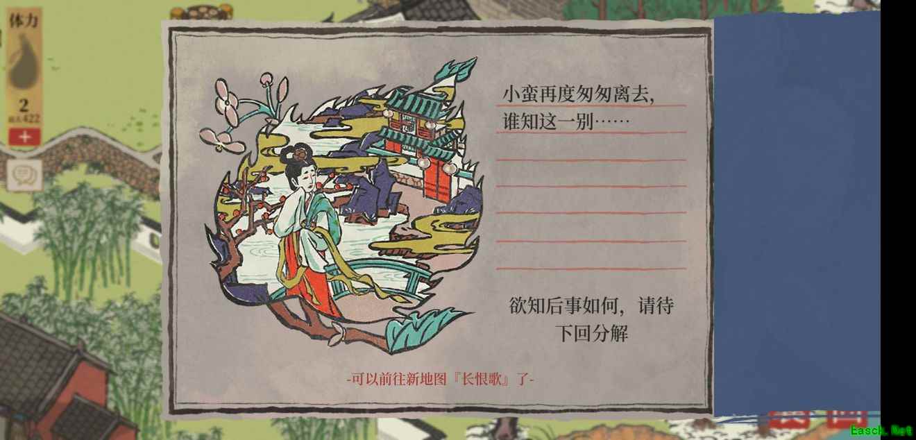 《江南百景图》钱塘春行玩法攻略本章难点: 1.任务40的三个井,需要依次完成任务 2.隐藏任务需要钓草龟,然后找到能交付草龟材料的井,解锁迷雾 ====================================== 1.敲敲白府大门 2.去白府厨房取酒 3.从酒缸里取一些酒(3/3) 4.回到餐桌 5.把酒放到餐桌上 6.去厨房放五辛盘 7.获得一个盘子 8.拿一些芫荽 9.拿一些芸薹 10.将芫荽和芸薹放进餐盘 11.拿一些大蒜 12.拿一些韭菜 13.拿一些大葱 14.将所有食材放进餐盘 15.回到餐桌 16.把五辛盘放桌子上 17.跟小蛮进行对话 18.点小蛮 点白居易 19.找酒曲(翻找仓库 20.取水 21.酿酒 22.埋酒 23.跟何婶进行对话 24.跟张木匠进行对话 25.冲碗藕粉 26.收集木头(获得20个百年老木) 27.收集荷花(获得10个荷花) 28.收集荷叶(获得10个荷叶) 29.跟张木匠进行对话 30.自己制作木牌(百年老木×20,荷花×10,荷叶×10) 有小游戏 31.立荷叶木牌 32.跟小蛮进行对话 33.跟工头周进行对话 34.收拾井边的工具 35.跟小虎进行对话 36.跟大水进行对话 37.和大家一起通井 有小游戏 38.获得一支残荷 39.摆一支残荷 40.检查剩余的井(3/3) 一共有三个井,第一个井要清理完杂草(即任务41)才能去第二个 第二个井要完成观察古井的任务,即任务44,45 建议制作砖头的时候直接做3次,这样不用来回跑 41.清理杂草 42.制作砖头(碎石块×20) 有小游戏 43.砌砖 44.学习古方井的工艺 45.通井 46.制砖,同42 47.修复方井 48.制砖,同42 49.砌砖 50.垂钓看看是不是真的有白龟 51.放龟 52.损坏的小方井 53.制作些有纹理的砖头(碎石块×10,荷叶×10) 54.砌井 55.刻字 56.把砖放上去 57.去月老祠58.藏东西在残荷