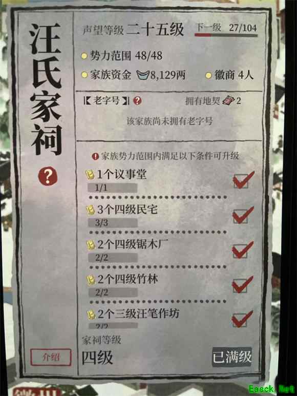 《江南百景图》徽商培养方法介绍在议事堂培养徽商【家祠等级数=徽商人数】 注意:摆放不当或移动家祠导致的家祠降级,降后等级数=徽商可用人数,不可用徽商显示停职观察,家祠等级恢复后可用。 在议事堂派遣徽商经商【一级家祠经商物资最低200一趟,二级家祠经商物资最低400一趟,时间上是物资越多,时间越长,收益方面都低。物资少或者刷次数建议先不升家祠等级,也可忽略此建议】