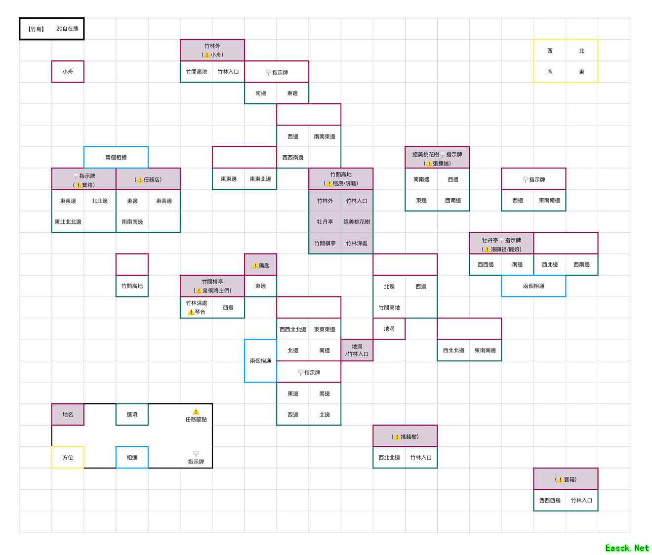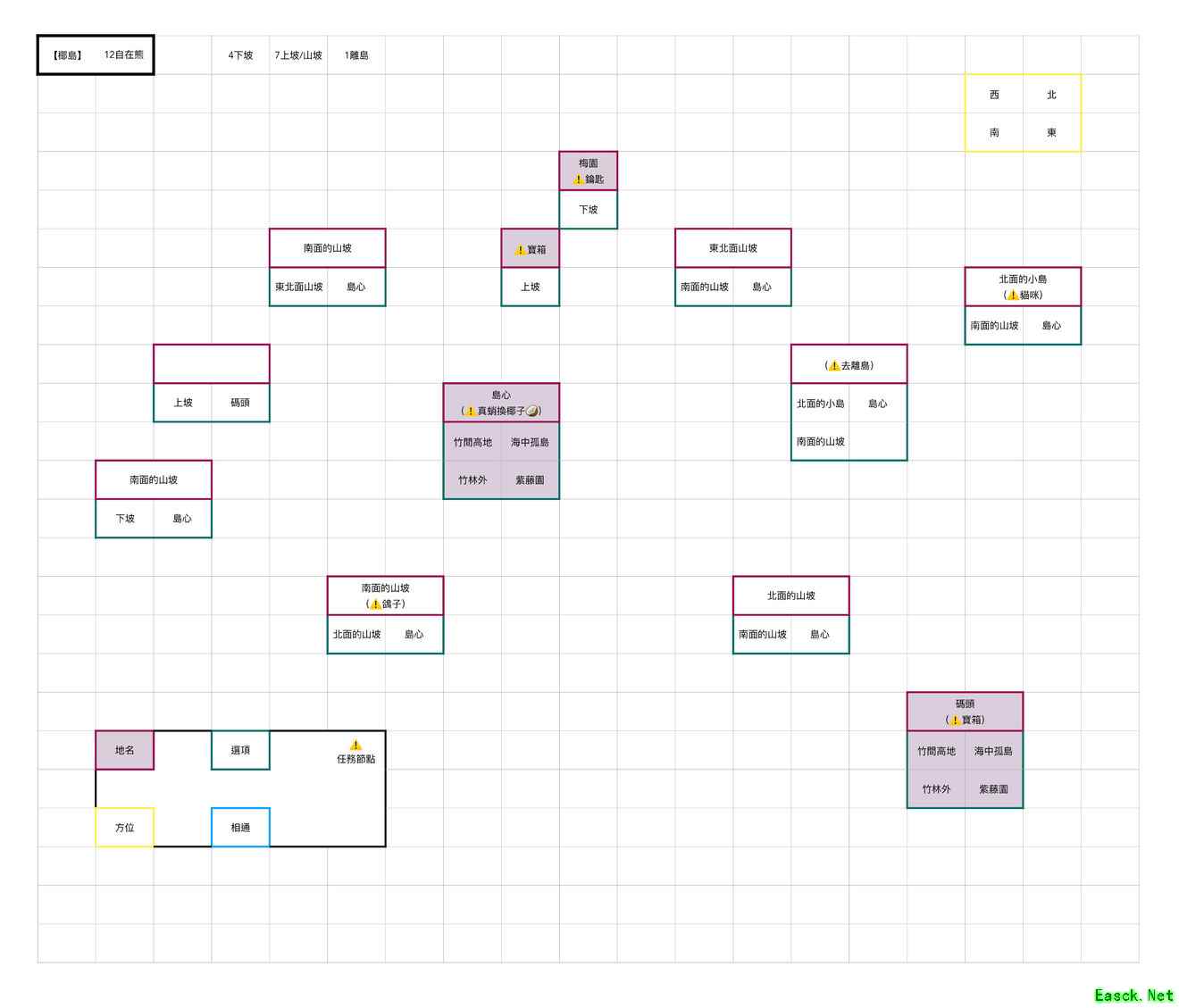 《江南百景图》自在熊布局攻略两张表格分别是[竹岛]和[椰岛]的自在熊布局,涉及剧透。 带色彩的框有各自含义标注在表格左下角,色块是重要的地点,感叹号是一些我记得的剧情点要记得去。 [竹岛]20个自在熊比较复杂,东南西北是基于你点的那只熊为中心,比如同样是东边但不一定是同一只,两个东是指往东第二个,十分没有定性且十分模糊,所以建议配合着地图来跳转比较保险。 [椰岛]12个自在熊选项比较简单,比较麻烦的是地图太大,没有小图容易走失,所以也建议配合着地图方便清场。