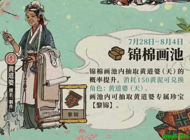 锦棉黄泥画池活动介绍活动时间: 7月28日11:00至8月4日23:59 活动内容: 【锦棉黄泥画池】开启!天级居民 黄道婆 概率提升。 可消耗150黄泥直接兑换黄道婆,并且可以抽取黄道婆的专属珍宝。