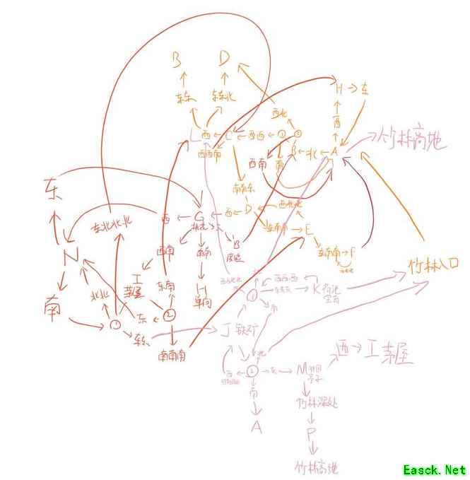 《江南百景图》周年庆特别探险活动地图路线一览路痴表示要被竹林探险的地图给逼疯了,不仅没有方向感还偏偏想每一块地点都搞清楚……差点没被这个破地图气得摔烂平板。 于是花了一下午手绘了完整版竹林地图,每一个区块用大写字母表示,分ABCDEFGHIJKLNMP共十五个主要地块,和“竹林深处”“竹林入口”两个小地块,按雕像指示方向连线。如果一个地区有两个雕像,则按大致分布标记为①、②。 画得有点凌乱,但足够全。