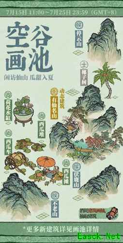 空谷画池活动介绍【活动时间】 7月15日-7月25日 【活动内容】 【空谷画池】开启!画池内含「有仙名山」、「停云山」、「伏鹿山」、「不老山」、「西瓜车」、「西瓜摊」、「西瓜堆」等多款限时活动建筑。