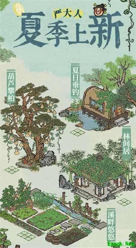 《江南百景图》严大人夏季上新建筑介绍7月19日补丁更新后,严大人春季限定建筑将会下架 4款全新夏季限定建筑——葫芦攀柏、夏日垂钓、溪畔悠悠、林间居 开启兑换。