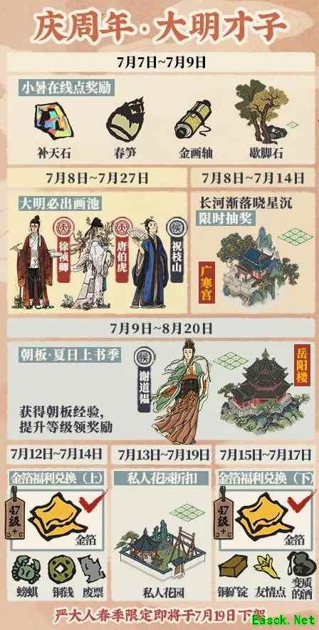 2021年庆周年大明才子活动介绍1、小暑在线奖励 7月7日-7月9日-【小暑在线奖励】开启!累计在线时长即可获得补天石、金画轴、歇脚石、春笋等奖励; 2、大明必出画池 7月8日-7月27日-【大明必出画池】开启!天级居民徐祯卿、唐伯虎及侯级居民祝枝山概率up。画池内首次获得的天级居民必为尚未拥有的专属up角色。若均已拥有,则无必出效果; 3、长河渐落晓星沉 7月8日-7月14日-【长河渐落晓星沉】限时抽奖开启!参与即有机会获得【广寒宫】; 4、朝板·夏日上书季 7月9日-7月20日-新活动【朝板·夏日上书季】开启! 参与建设江南小镇可通过【木简】助力知府们提升经验,免费获取补天石、铜钱等奖励; 付费购买【象简】权益,提升朝板经验即可解锁专属奖励:全新侯级居民【谢道韫】、全新建筑【岳阳楼】。谢道韫预计将于9月加入精英画池;