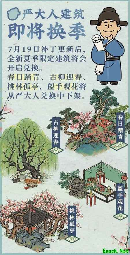 6、夏季限定建筑 此外,7月19日补丁更新后,严大人春季建筑将下架,全新4款夏季限定建筑开放兑换!