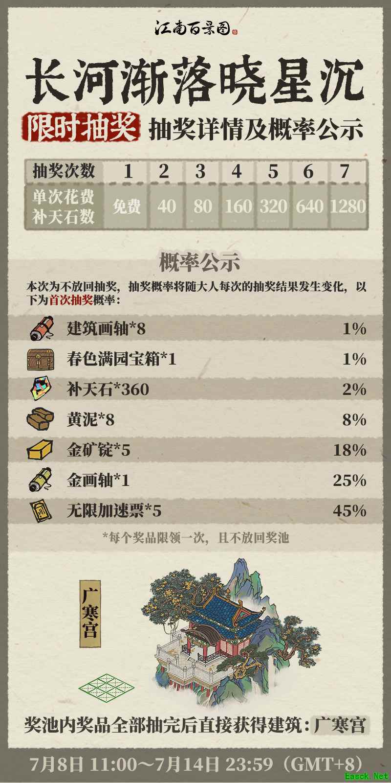 以上就是《江南百景图》长河渐落晓星沉抽奖活动一览,更多游戏攻略请持续关注手游网! 本文内容来源于互联网,如有侵权请联系删除。 |