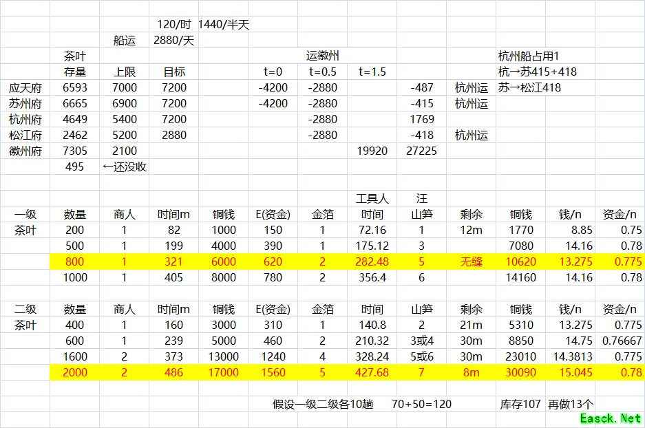 简单概括,花一天半时间运2w茶叶,占用六条船,加上本身徽州有的茶叶一共2w7,直接开刷 时间不一定要整齐,反正有半天时间消耗,只要接上需求就行了(给自己中午迟了运茶叶打个预防针 用汪五峰跑,用山笋减时间,不用白不用,平时用高制作的做饭,用的是78%跑给8个,理论60%也是一样收益,如果有80%出9个的例子请告诉 原来的计划是三天垄断,后来算了一下两天垄断也行,就改成两天了,还不用另外生产了 在两城肝竹子供给汪家的时候也囤了点茶叶用盐商运到徽州(还不小心破产了一次,新开了城市运盐全运错了……盐船停在徽州下不来) 以上就是《江南百景图》徽州府茶叶交易方法,更多游戏攻略请持续关注手游网! 本文内容来源于互联网,如有侵权请联系删除。 |