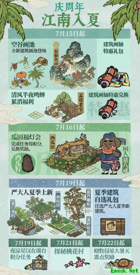 7月15日-7月25日 -【空谷画池】开启!画池内含「有仙名山」、「停云山」、「伏鹿山」、「不老山」、「西瓜车」、「西瓜摊」、「西瓜堆」等多款限时活动建筑; - 【清风半夜鸣蝉】累消福利活动开启!累计消费补天石到一定数额,即可获得【孟母老宅】; - 【建筑画轴】优惠兑换活动开启,【建筑画轴】特惠礼包开放购买。 以上就是《江南百景图》江南入夏活动攻略,更多游戏攻略请持续关注手游网! 本文内容来源于互联网,如有侵权请联系删除。 |