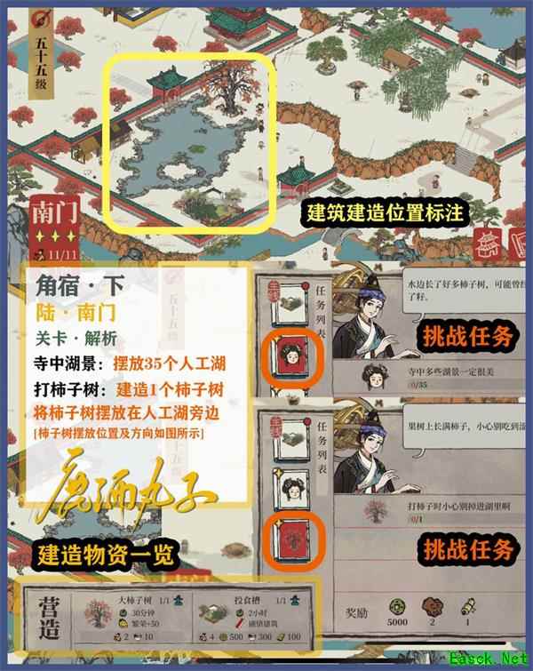 《江南百景图》角宿下南门通关攻略柿子树摆放位置及方向如图所示: 这一关主要是在寺中湖景摆放25个人工湖,打柿子树,将柿子摆放在人工湖旁边