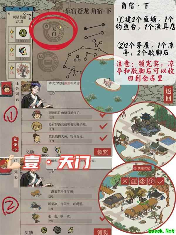 《江南百景图》天门任务完成攻略鱼塘被我承包了:建造两个鱼塘 没有好渔具:建造一个钓鱼台; 放长线钓大鱼:建在一个渔具店; 渔家茅屋住汀州:建造两个茅屋 可乘凉、可闲坐、可观景:建造一个凉亭; 走一走,歇一歇:建造一个歇脚石。 注意完成这关,领完的奖品,凉亭和歇脚石可以收回到仓库里去