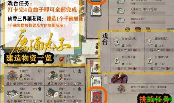 1、戏台建造:营造一剧情 2、戏台任务:打卡完4首曲子即可全部完成