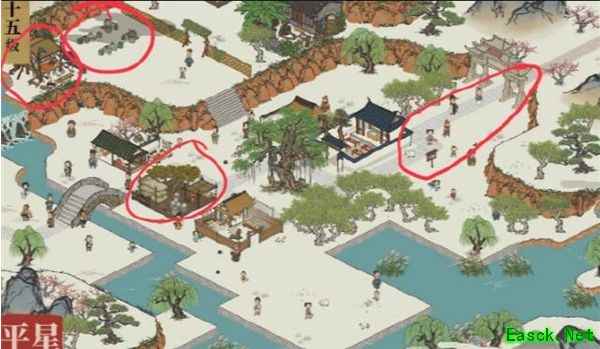 完成方法: 1、摆放10颗桑树, 2、建造1个养蚕厂, 3、建造一个丝织坊, 4、建造一个丝绸店, 5、将丝织坊和丝绸店用道路连接起来, 6、建造1个勾栏, 7、摆放2个休憩桌, 8、摆放2个茶水摊(休憩桌和茶水摊需要知府自备) 9、将牌坊和指路牌用道路连接起来。 建造位置如图所示: