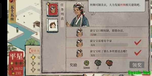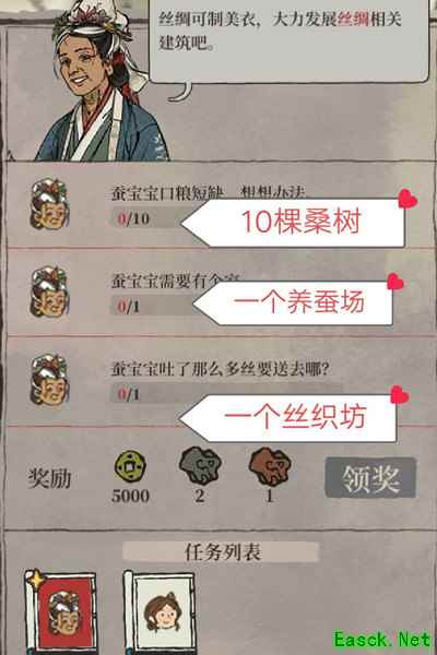 任务列表: 蚕宝宝口粮短缺,想想办法。(0/10) 蚕宝宝需要有个家。(0/1) 蚕宝宝吐了那么多丝要送去哪?(0/1) 绸缎如此丝滑,一定能卖得好。(0/1) 送丝能有道路就能省点脚力了。(0/1) 真希望丝绸能快点运到店中。(0/1) 一天不看戏,睡觉都不香。(0/1) 看戏还需要能坐着休憩的地方。(0/2) 好像有叫卖茶水的声音?(0/2)
