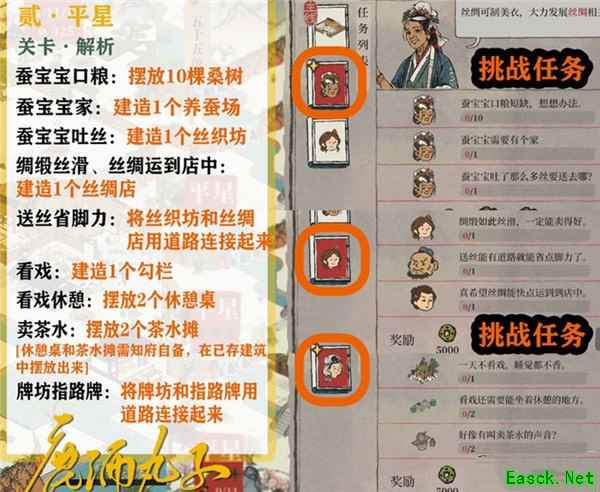 平星任务需要小伙伴们通过种植桑树、建造养蚕场,否则无法完成,具体如下: 1、指示牌与牌坊的连接,修路连接两者,道路要穿过牌坊与城外道路脸上。 2、养蚕致富,该任务需要建造足量的桑树,一座养蚕场(它一定要建在道路边上),和一座丝织坊 3、听曲儿任务,一个勾栏,两个茶水摊和休憩桌。