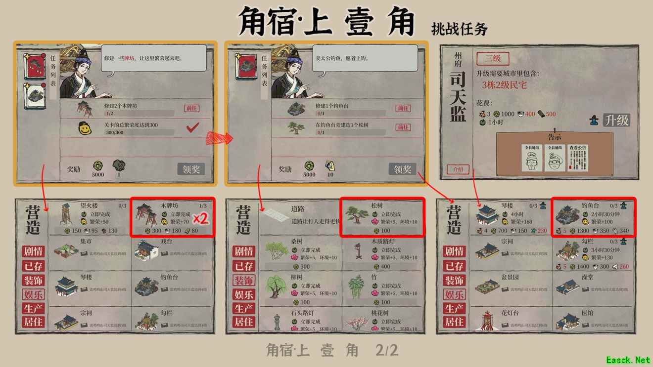 关卡的繁荣度要求这里可以基本忽视,因为建完其他的建筑就会自动达成的。 建设钓鱼台,需要先把鸡鸣山州府司天监的等级升到四级(其实也就是往上升一级而已)。 顺便一说,四级的司天监只能走到第八个角宿关卡,要通关完角宿还是得要升到五级。司天监满级十级,剩下的倒是不着急。 松树则是记得建在钓鱼台的旁边,别隔太远了。