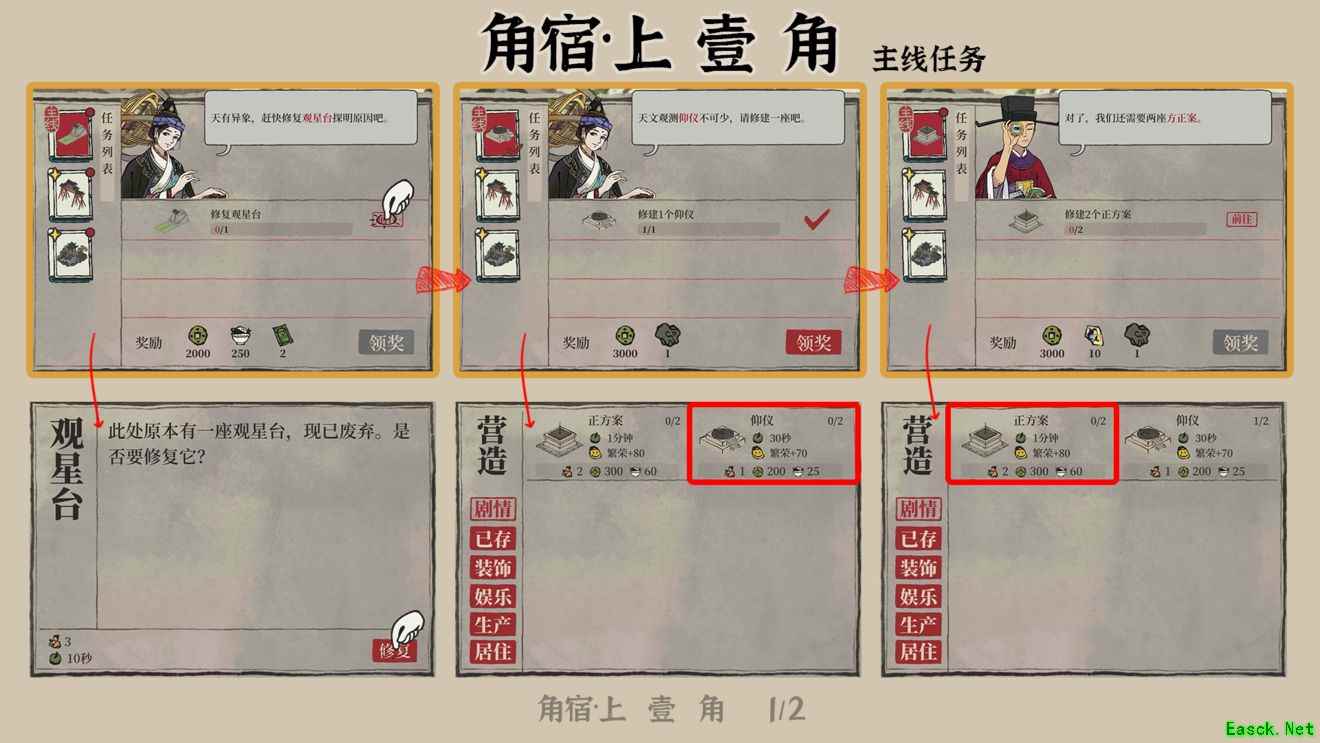 《江南百景图》角宿上壹角任务攻略主线这里只需要建造一个仰仪,但营造-剧情处是能建两个仰仪的。出于节省资源的目的,建议建一个就行。