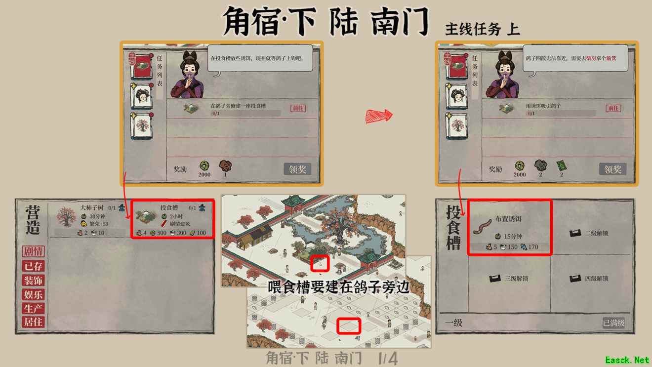 《江南百景图》宿下陆南门任务攻略在主线任务方面喂食槽一定要建在鸽子旁边,鸽子在院子里,看不清楚的话可以放大找一找。