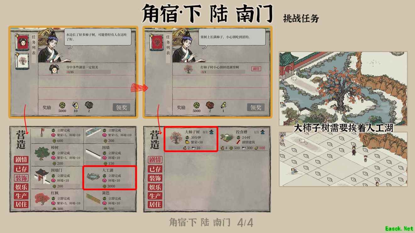 挑战任务是建人工湖和大柿子树,要注意的是柿子树需要挨着至少一格湖水。