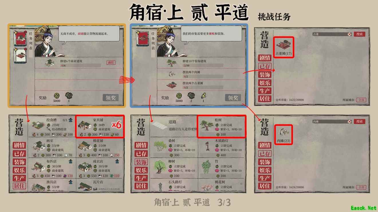 建商业建筑可以六个都建一样的,挑最简单的建就可以。这样可以最大程度的节省玩家物资。 肉摊和古董滩用完了记得收回仓库,以后能重复用的。