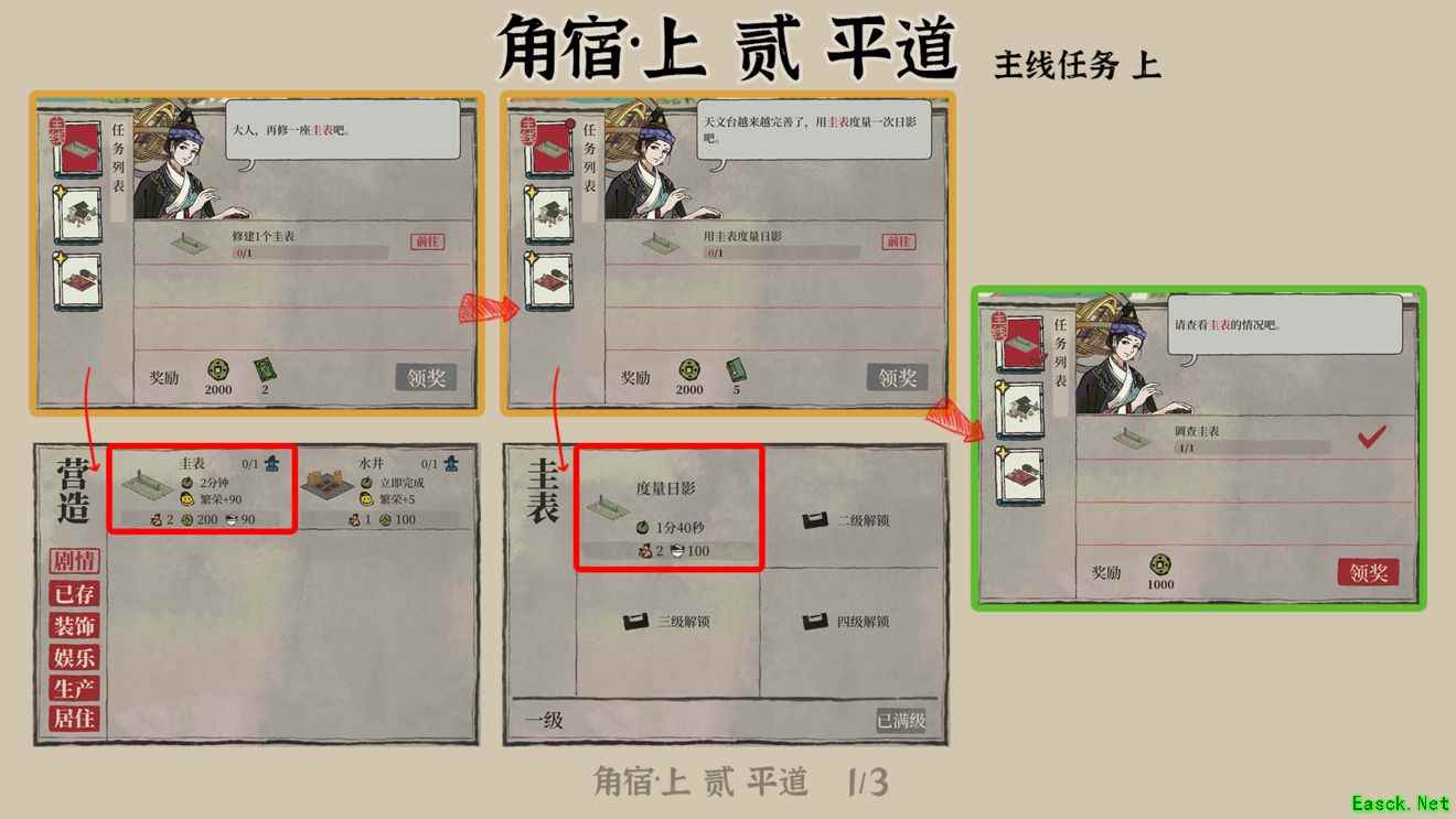 《江南百景图》角宿上贰平道任务攻略主线方面根据要求建造即可,依次建造圭表、度量日影、水井和石头路灯即可完成主线。