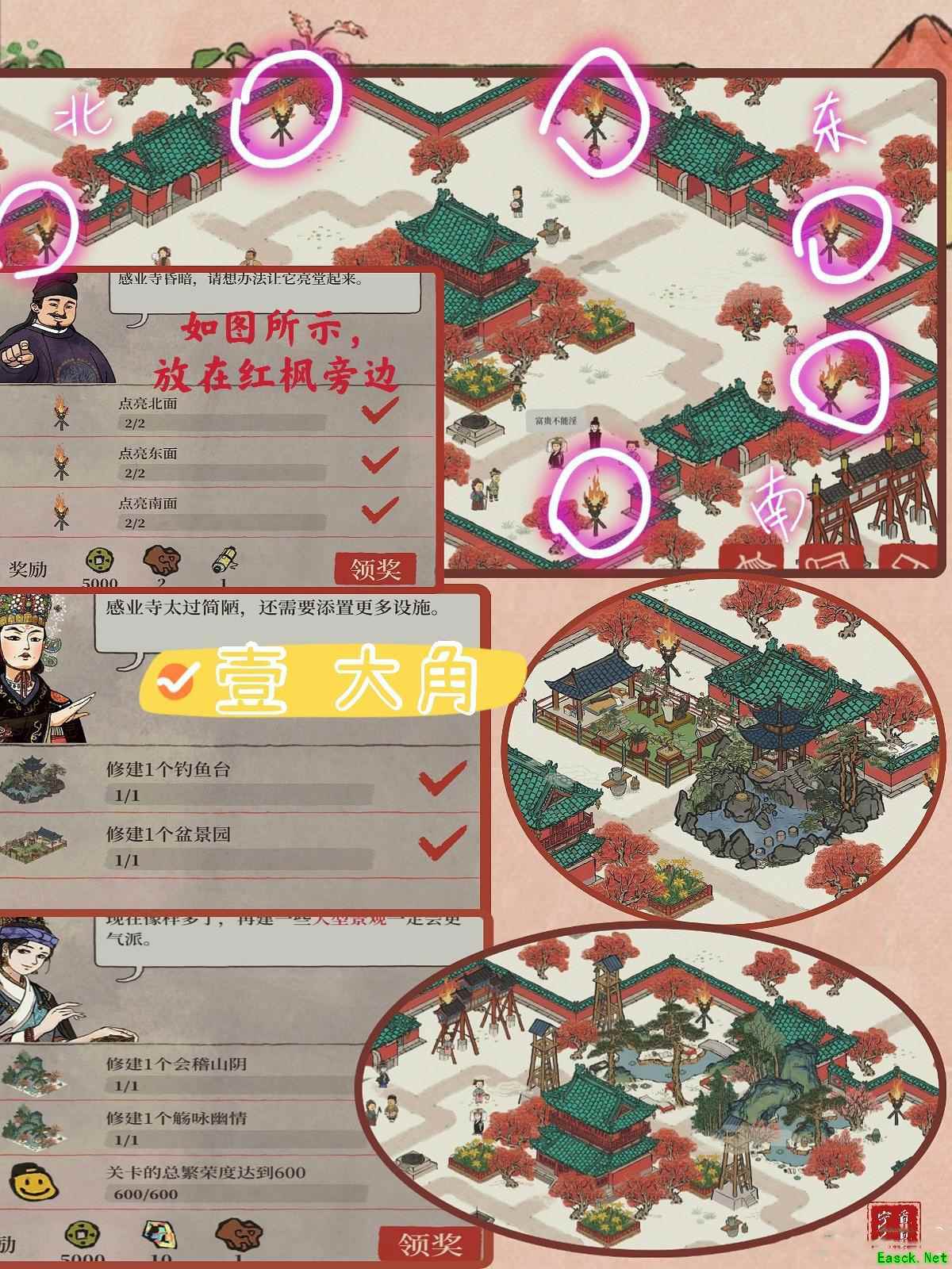《江南百景图》亢宿第1关大角通关攻略这一关按照提示来摆放建筑就可以了!