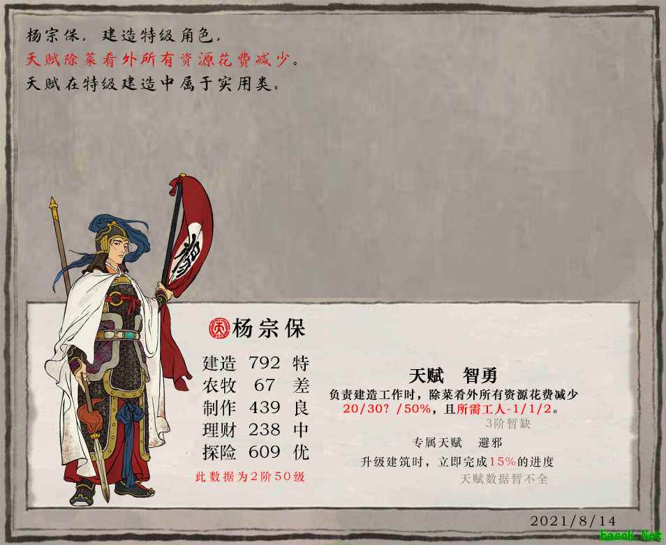 《江南百景图》杨宗保培养攻略【人物属性】 初始属性:建造177,农牧23,制作243,理财133,探险337 满级属性:建造792,农牧69,制作445,理财252,探险617 【双倍书籍】 水浒、史记 【天赋-智勇】 负责建造工作时,除菜肴外所有资源花费减少50%,且所需工人-2。 【珍宝推荐】 澄泥砚 【人物简评】 1、杨宗保是建造特级角色,属于实用又好看的类型,算是很不错的新角色; 2、在建造的时候,很多资源花费都会减少,还会减少工人的需求量,非常适合开荒。