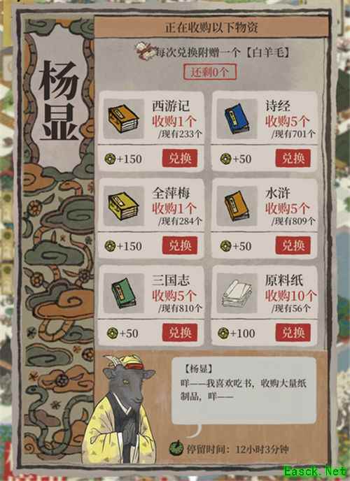 《江南百景图》杨显兑换物品一览杨显: 提供白羊毛 收购物品: 西游记、诗经、金萍梅、水浒、三国志、原料纸