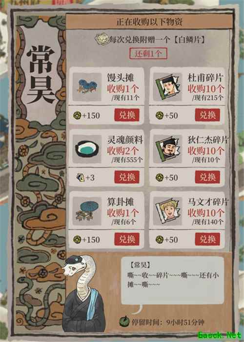《江南百景图》常昊兑换物品一览常昊:提供白鳞片 收购物品: 馒头摊、杜甫碎片、灵魂颜料、狄仁杰碎片、算卦摊、马文才碎片