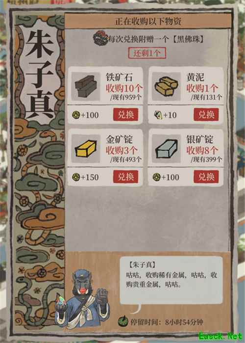 《江南百景图》朱子真兑换物品一览朱子真:提供黑佛珠 收购物品: 铁矿石、黄泥、金矿锭、银矿锭