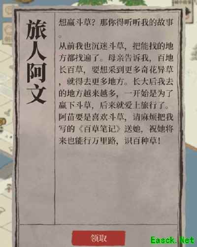 4、完成选择的玩家,可以得到金画轴的奖励,该活动难度还是比较低的哦。 斗草答案解析 1、玩家读完旅人阿文发过来的一封信得知,阿文曾经也喜欢斗草。 2、后来经过母亲的启发,外出见识更多的奇花异草,在这过程中喜欢上了游历。 3、游历不仅可以帮其赢下斗草,还可以帮其增长很多的知识,为此还写了《百草笔记》。 4、所以旅人阿文建议阿苗长大之后,可以多多游历,将来可以前往更多地方见识更多花草。