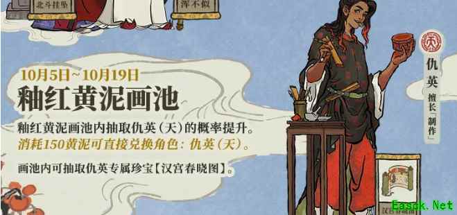 釉红黄泥画池活动介绍【活动时间】 10月5日11:00至10月19日23:59 【活动内容】 【仇英】概率提升。可消耗150黄泥直接兑换【仇英】,并且可以抽取仇英专属珍宝。