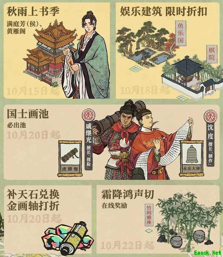 10月15日-11月26日 - 【秋雨上书季】开启! 10月18日-10月24日 - 娱乐建筑【鱼乐国】【棋院】开启限时优惠建造折扣。 10月20日-10月24日 - 补天石优惠兑换金画轴。 10月20日-11月9日 -【国士必出画池】开启! 【戚继光】、【沈度】概率提升。画池内首次获得的天级居民必为尚未拥有的专属up角色。若均已拥有,则无必出效果。 10月22日-10月24日 -【霜降鸿声切】在线奖励活动开启!参与即可获取补天石、金画轴等奖励。