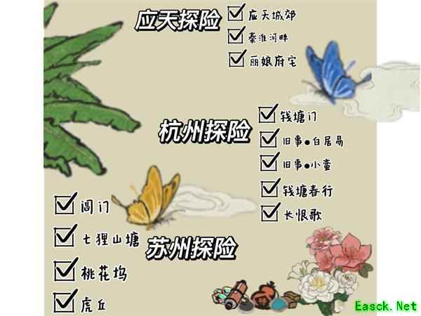 《江南百景图》和鸣双凤喜来仪资源兑换攻略百合花:应天城郊✅丽娘府宅✅阊门✅虎丘✅长恨歌 钱塘春行✅钱塘门✅旧事•小蛮 栀子花:阊门✅桃花坞✅钱塘门✅钱塘春行✅七狸山塘 山茶花:七狸山塘✅钱塘春行✅长恨歌 牡丹红:应天城郊✅丽娘府宅✅秦淮河畔 松烟墨:应天城郊✅丽娘府宅✅虎丘
