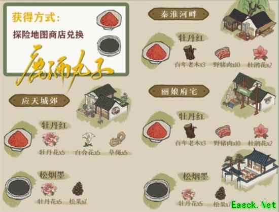 《江南百景图》松烟墨探险资源兑换地点介绍险地图商店兑换 丽娘府宅[书院]——松烟墨 虎丘[画室]——松烟墨 应天城郊[画室]——松烟墨