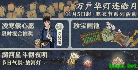 《江南百景图》寒衣节活动介绍寒衣节活动详情 活动时间:11月5日后正式上线 1、凌寒偿心愿 活动期间,文汉儒将会加入限时的混合抽奖活动。玩家可以凭借喜好进行抽取。 2、珍宝画池 新的一批珍宝将伴随珍宝画池进行上线,玩家等活动上线后自行获取即可。 3、放河灯 玩家可以在寒衣节的晚上进行河灯的点燃与施放。河灯代表着祝福慢慢飘远。满满的节日气息。 4、听居民讲故事 玩家在活动期间,阅读居民的故事后,可以获得相应的奖励。 注:不仅如此,由于马上就要冬季,玩家可以在限时的活动期间获得穷奇雕像,战鼓装饰,石牌坊,静溪幽庐等等。奖励还是非常多的。感兴趣的玩家可以踊跃参与其中。