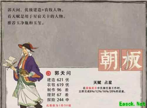 郭天问培养建议【人物属性】 初始属性:建造:95、农牧82、制作18、理财15、探险39 满级属性:建造:621、农牧619、制作96、理财67、探险244 【双倍书籍】 天工开物、道德经 【天赋:占星】 一星负责星宿关卡任意工作时,立即完成8%的进度。 二星负责星宿关卡任意工作时,立即完成12%的进度。