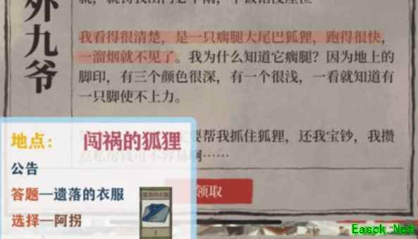 1.这一题的正确答案是阿拐,玩家们选择阿拐就可以了 2.回答正确之后就可以获得今天的活动道具,遗落的衣服了,遗落的衣服可以用来兑换聚宝盆,玩家们一定要收到,等到收集全部的道具之后再去兑换 以上就是《江南百景图》哪位是闯祸的狐狸答案介绍,更多游戏攻略请持续关注手游网! 本文内容来源于互联网,如有侵权请联系删除。 |