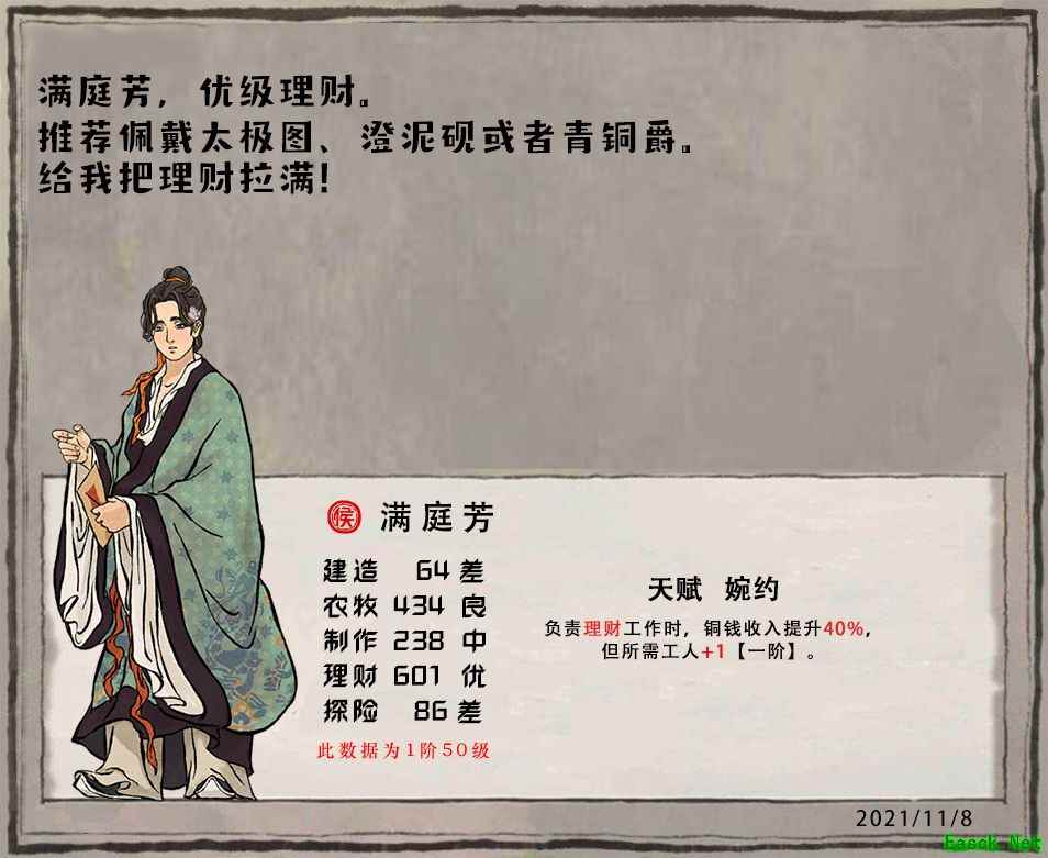 《江南百景图》满庭芳天赋技能介绍据说是以“qinguan”为原型的,具体事迹可以自行查询哈 推荐佩戴太极图刷钱! 推荐可以直接无脑放去理财,收益提高的还比较多