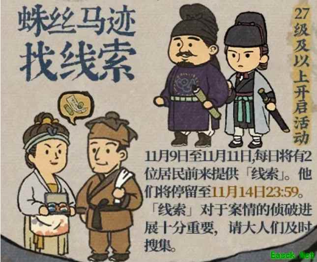 蛛丝马迹找线索活动介绍【活动时间】 11月9日至11月16日 【活动内容】 活动期间内,每日将有3位居民带着礼物及故事前来拜访,除去真小镇居民带来的丰厚礼物之外,说不定就有假钱贩子混入其中!知府大人请注意侦查收缴【铅银袋子】。 此外,11月9日至11月11日,每日还会有2位居民前来提供【线索】,他们将停留至11月14日23:59。收集【线索】和【铅银袋子】解锁【明察暗访辨真伪】的最终剧情。