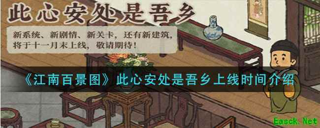 在江南百景图游戏中很多玩家还不清楚,此心安处是吾乡新版本的上线时间是什么时候。下面就让小编给大家带来《江南百景图》此心安处是吾乡上线时间介绍,感兴趣的小伙伴们一起来看看吧。